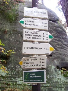 Na rozcestí Pánovo pole odbočíme na žlutou a vydáme vstříc vyhlídkám a průchodu skalním bludištěm Chléviště. Po žlutém značení dojdeme až na rozcestí Kalich – modliteb