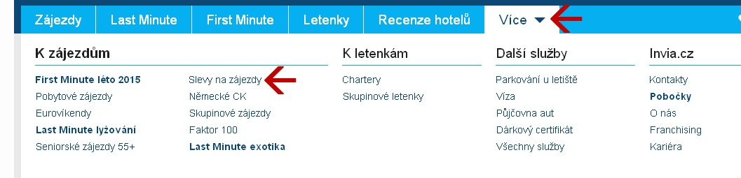 Invia má odkaz na různé slevy v záložce Více v hlavním horním menu, kde je následně odkaz na Slevy na zájezdy a zde jsou popsány jednotlivé slevy a mezi nimi i slevy na dítě.