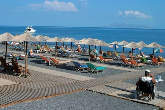 Pláž s hrubým lávovým pískem, místy s oblázky a pozvolným vstupem do moře je vzdálená cca 100 m od hotelu. Slunečníky, lehátka a vodní sporty na pláži za poplatek.