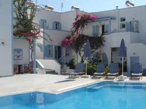 Hotel se nachází v klidné části letoviska Kamari, 6 km od letiště a cca 100 metrů od pláže s hrubým lávovým pískem, podél níž se táhne 2 km dlouhá promenáda s širokou nabídkou barů, obchodů, typických taveren a restaurací. V blízkosti hotelu (cca 50 m) se nachází autobusová zastávka, odkud je možné dostat se do hlavního města Fira vzdáleného 9 km.