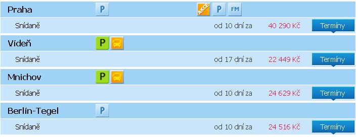 - Doprava: letecky, odlet Praha, Vídeň, Mnichov, Berlín