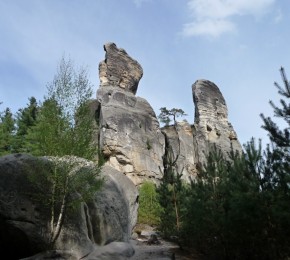 Na dalším rozcestí odbočíme na modrou a skalní průrvou se zase spustíme mezi skály. A přes Adamovo lože a další úzkou průrvu se dostaneme na malé náměstíčko ve skalách a tzv. myší dírou , po zelené, se dostaneme nahoru na parkoviště před zámkem Hrubá Skála.